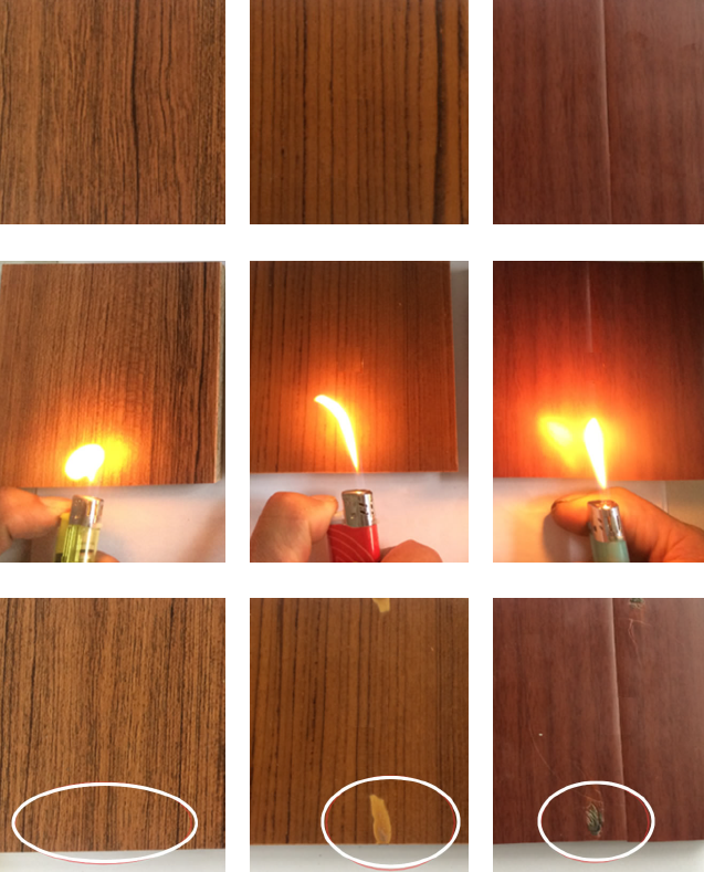 三种不同材质饰面,同时灼烧10秒