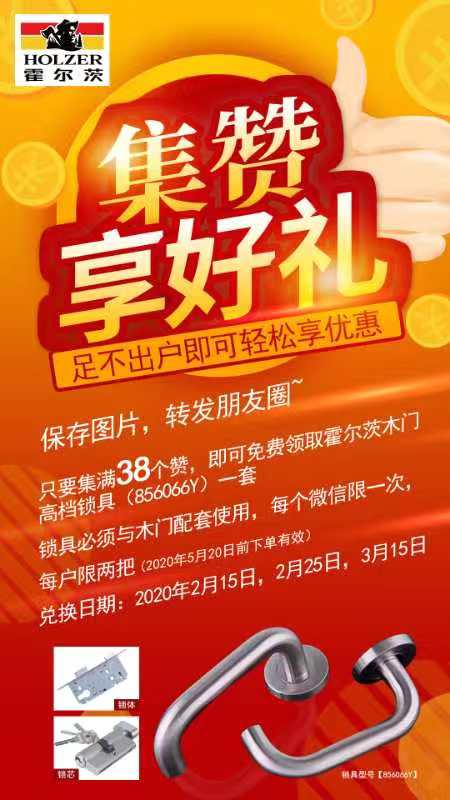 2020年2月25日,霍尔茨“集赞换锁具,轻松享好礼”的重磅优惠活动再度火爆来袭,专为品质木门打造的高档精良锁具,助力消费者享受舒适家居生活!特殊时期,霍尔茨以低至冰点的价格推出功能强大、时尚美观的木门回馈消费者,作为木门中频繁与人接触的锁具当然也不能落下。保存下方霍尔茨锁具活动图片,转发朋友圈,只要集满38个赞,即可免费领取做工精致细腻、贴合人体触感、手感顺滑的霍尔茨T型门专用偏心锁856066Y一套(包含把手、锁体、锁芯、钥匙),锁具必须与木门配套使用,每个微信限领一次,每户限领两把。需要特别注意的是,该活动在2020年5月20日前下单有效,兑换日期为2020年2月25日、3月15日。领取方式详情请咨询霍尔茨门店店员。